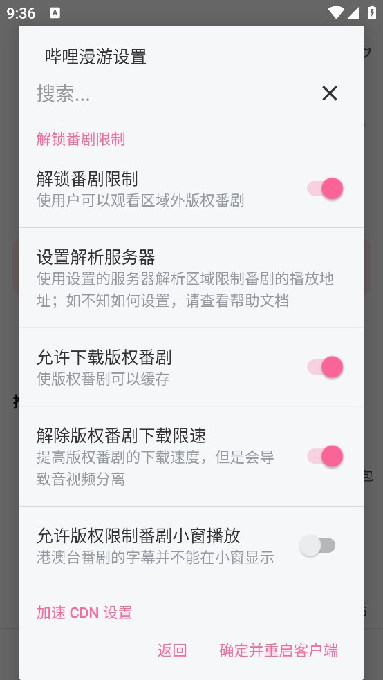 5、进入哔哩漫游设置,将“解锁番剧限制”、“允许下载版权番剧”等打开