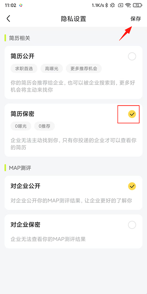 3、勾选简历保密,点击保存即可。