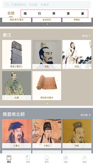 2、点开碑帖,可以发现各种字体以及各个朝代的书法大家;