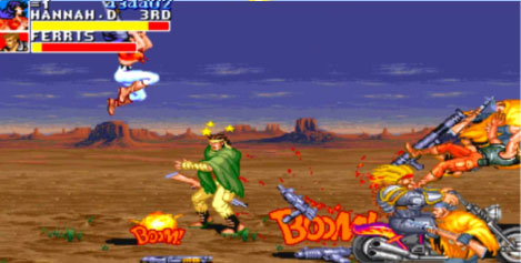 6、关口BOSS变白痴法!!自己独创的。首先想办法让他两双的大刀全部落在屏幕场景的中线上(叠放在一起更好),而BOSS已经被揣出屏幕,马上将身位移到屏幕最靠外的线路上,会发现BOSS丧失一切技能,只会傻子似的从屏幕缓缓的走出来,不会跳,也不会碎步移了,哈哈,你就折跑回去把他再度踢出屏幕,然后他再白痴一样慢慢的又走回屏幕,然后再踢…反复致死!!但是注意一定不要在上下移了,一旦离开这跳横线路,BOSS马上又活蹦乱跳起来。