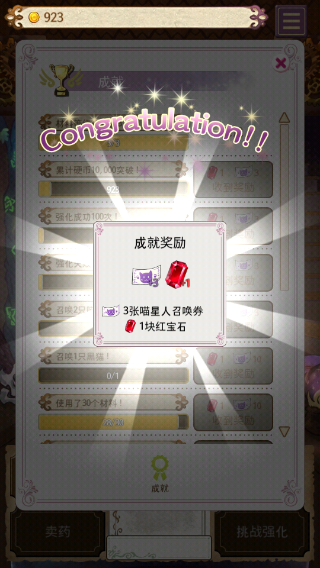 4、药水也可能会强化失败。强化失败会破坏药水。不过偶尔破坏几个药水来看看妹子摆出这个表情也是不错的"5、在药水成功升级到满级后,成功强化概率处会显示‘X’,时就不建议继续放材料了。因为没办法继续升级来让价格翻倍。这时只要点击左下方的‘卖药’选项就好了。