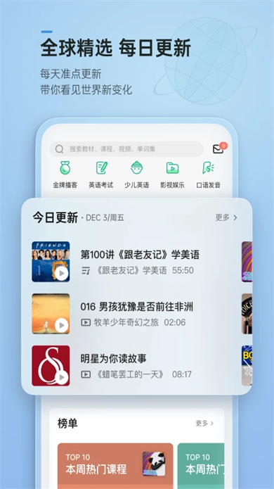 场景化学习体验:影视学习板块结合剧情讲解实用表达,如《老友记》中的日常俚语,帮助用户在语境中记忆词汇。模拟真实听力场景(如机场广播、学术讲座),提升实际应用能力。
