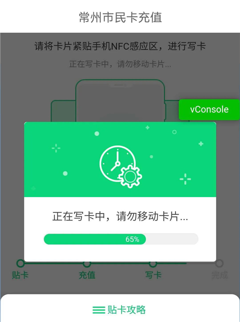 4、付款完成后保持交通卡紧贴手机背面NFC感应区,完成写卡操作至充值成功,点击【确定】,完成充值。充值过程中请勿移动卡片。