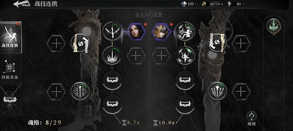 接下来根据指引将破盾者魂核与技能关联,提供属性加成和特色魂技。其中魂技分为主动和被动两种,主动魂技只有紫色及以上非素材魂核拥有,角色施放与该魂核关联的技能时会同时释放主动魂技。要注意每个主动魂技都有单独的冷却,在实际战斗中,非冷却中的技能如果与有主动魂技的魂核关联,其图标下方会有小点提示,其中绿点表示魂技已就绪,而橙色小点表示魂技还在冷却,使用关联技能不会触发相应魂技。