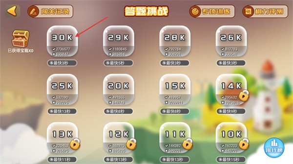 2、进入【答题挑战】页面后,选择对应等级的关卡(如【30K】),可进入具体答题环节。