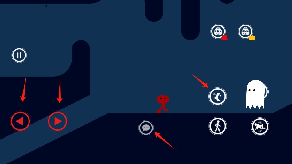 2、游戏中,由左下角的两个按钮控制主角移动,点击中间的按钮可与幽灵聊天,右边的按钮可控制主角做各种动作。