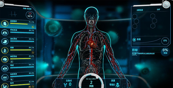 进入透视图,立马可以看到病人的健康状况以及各类初始buff,例如骨骼右下方的黄色负面buff 与神经系统左下方的蓝色正面buff。根据很多负面buff其实可以大大的帮助玩家判断病情方便诊断。而这个病人可以看到,已经成年并且步向老龄,机智的笔者立马意识到,病人的骨骼和肌肉虽然健康值也在下降,但很有可能是病人年龄过大造成的,非疾病影响,因此接下来诊断应该侧重于神经与血液系统。