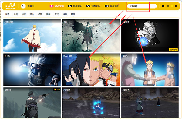 3、还可以搜索你喜欢的壁纸关键词,例如搜索火影忍者。