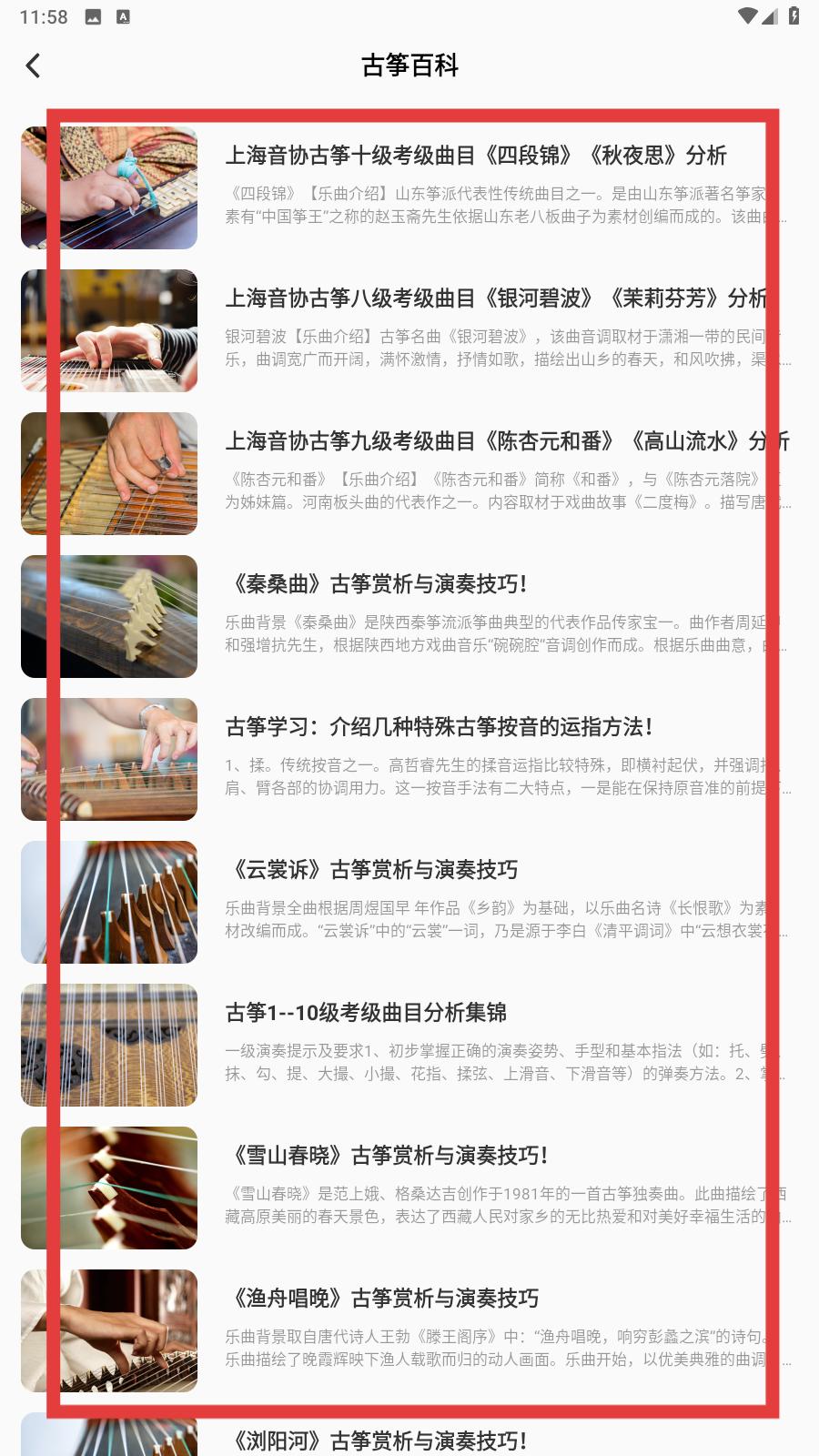 3、在古筝百科页面,浏览展示的文章列表,包含上海音协古筝考级曲目分析、古筝赏析与演奏技巧等内容,点击感兴趣的文章标题,即可查看详细内容。
