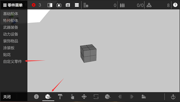 这八个方块即是您的图纸的初始内容,当您逐渐熟悉游戏后,可以尝试这样从零开始。作为初学者,我们建议您可以试试”自定义零件“这一便捷方式进行设计。