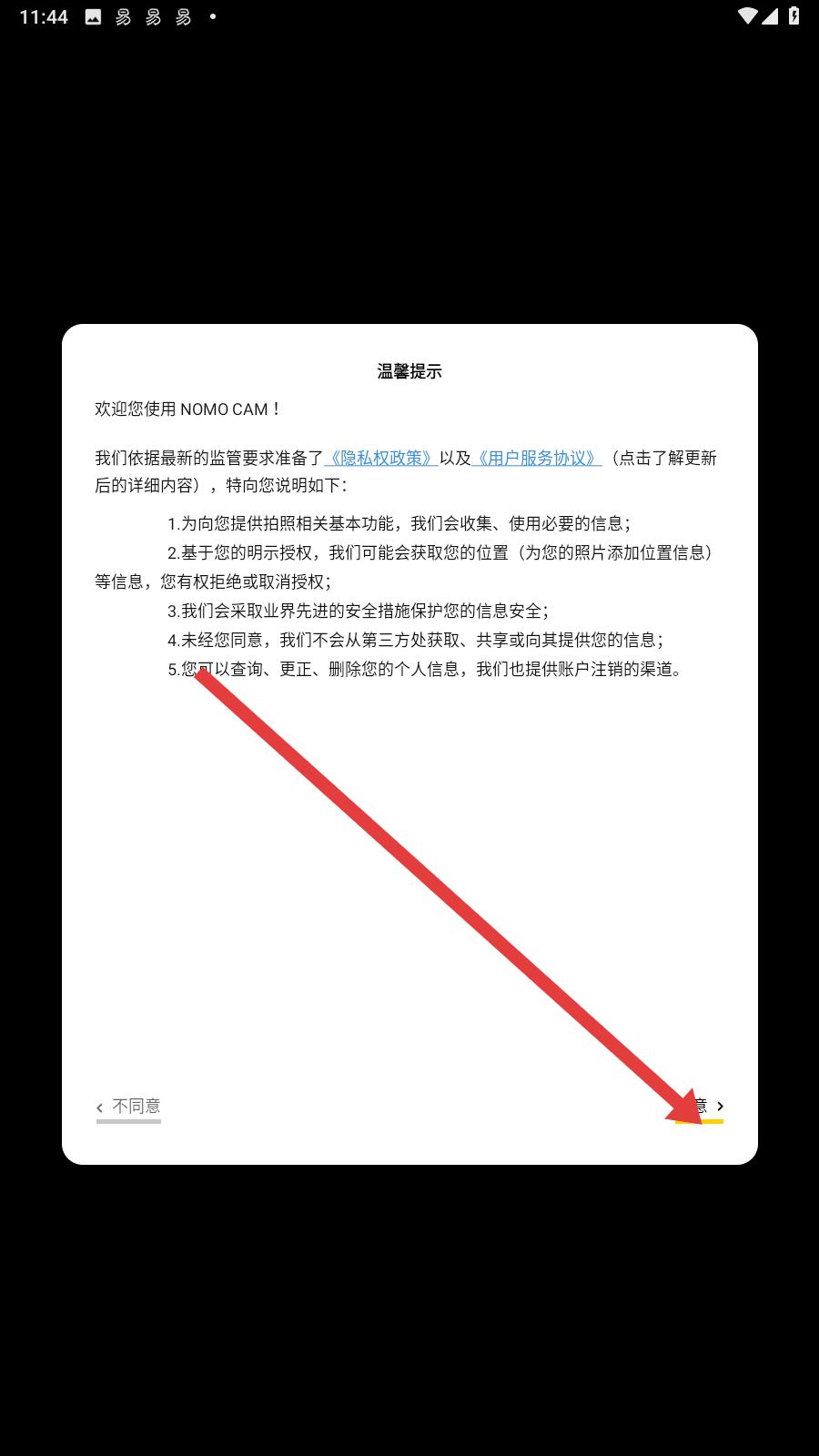 1、开NOMOCAM应用,弹出含隐私政策与用户协议的温馨提示,认真阅读后点击同意,进入模拟相机操作界面。