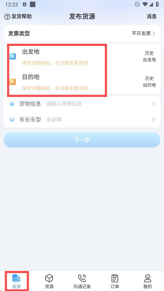 2、点击左下角发货按钮可以发布货源,根据提示填好信息后点击下一步即可。