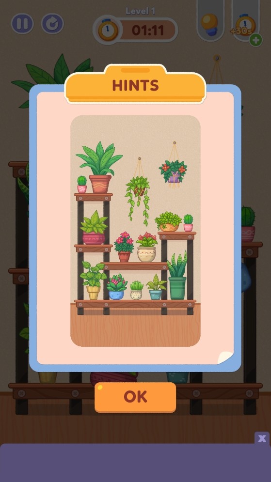 2、进入到关卡一,游戏操作很简单,用手点击屏幕将这些摆放杂乱的花盆摆放整齐即可。
