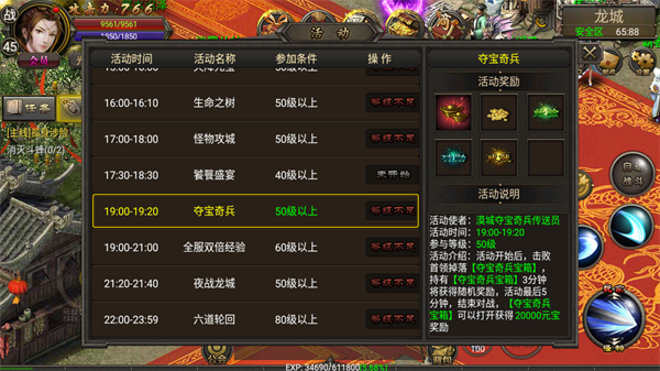 1、探宝:50级后,有条件的玩家可进行探宝,通常能获得经验丹,快速提升等级。