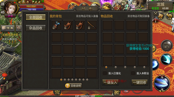 2、装备回收:低级装备可通过回收获得大量经验,每次击杀怪物掉落的装备(无论高低级)全部捡起,攒满背包后到龙城装备回收员处回收。