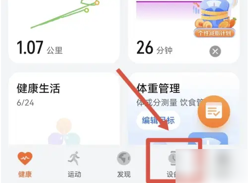 在荣耀手机的运动健康页面点击切换到设备选项。